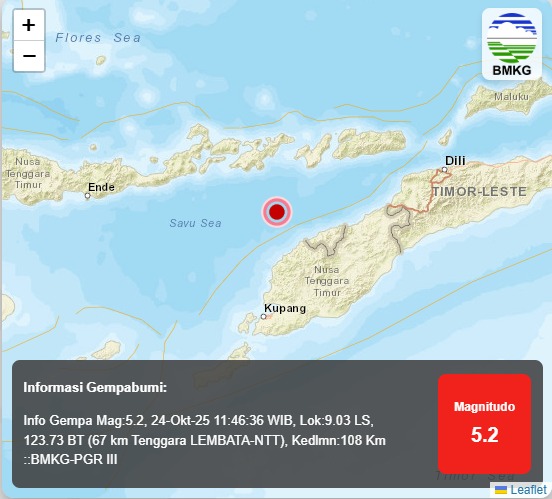 Gempa yang berpusat pada 9.03 LS, 123.73 BT, atau 67 Km Tenggara Lembata, pada kedalaman 108 km itu dirasakan bergetar dan sekejab. Belum diketahui dampak gempa tersebut.