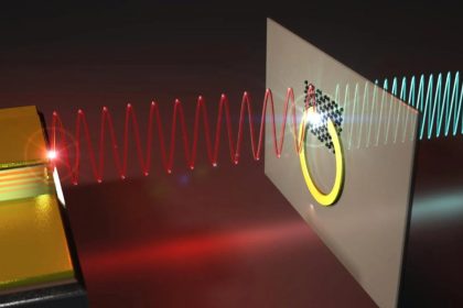 Ilustrasi di atas menunjukkan bagaimana cahaya bisa diubah menjadi frekuensi lebih tinggi (HHG) di wilayah terahertz, yaitu gelombang elektromagnetik di antara cahaya inframerah dan gelombang radio.(D...